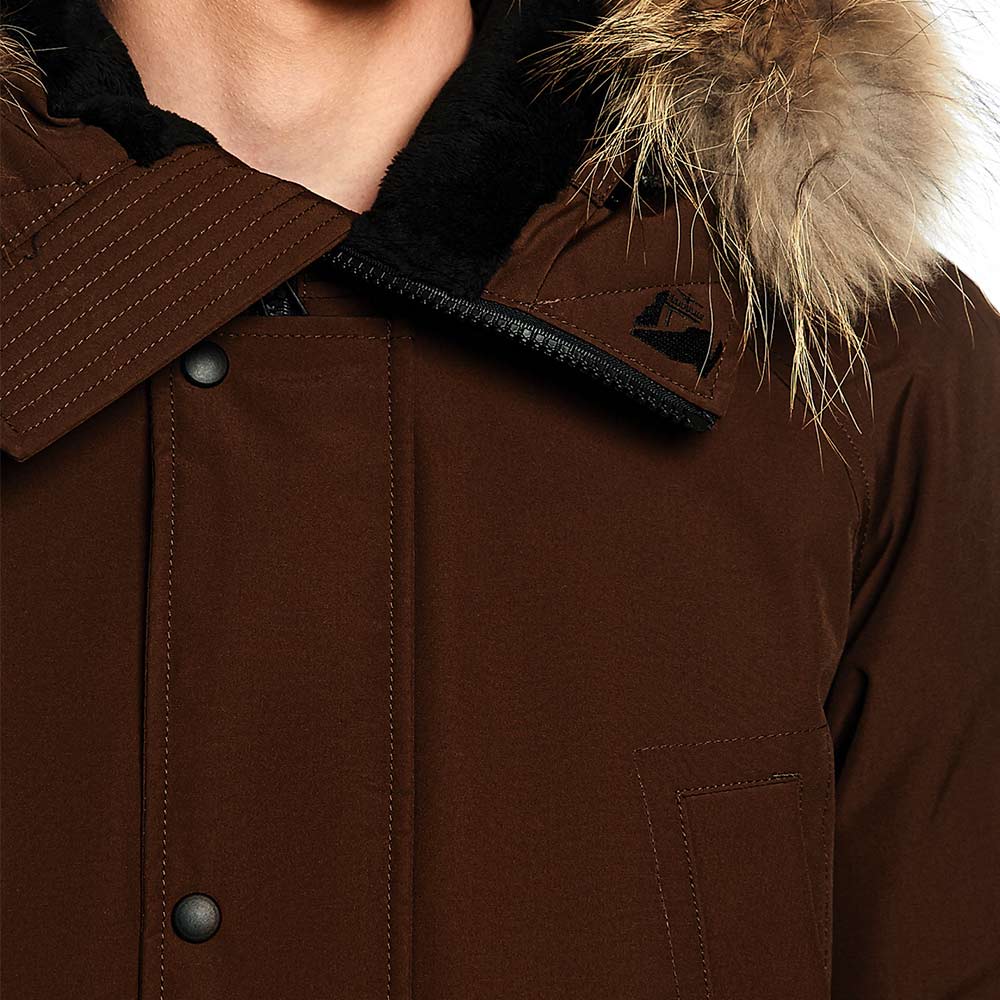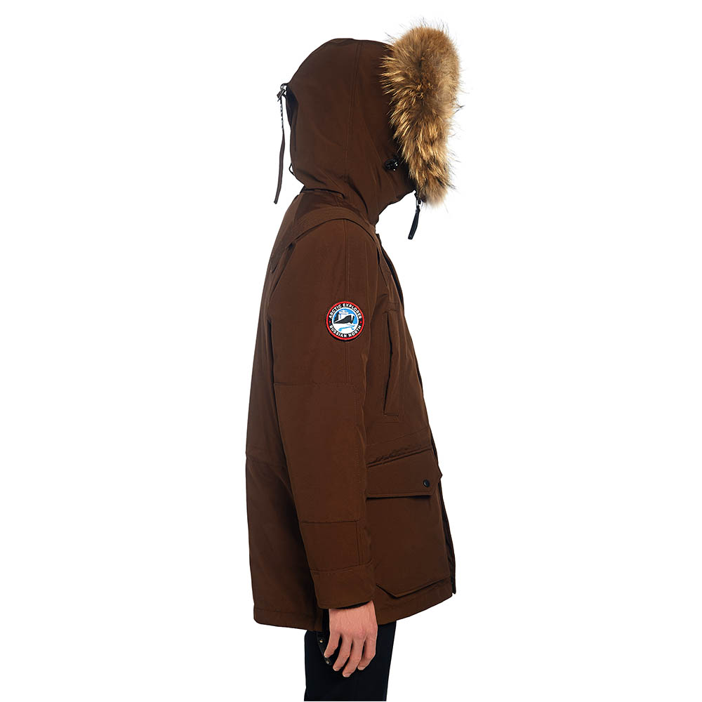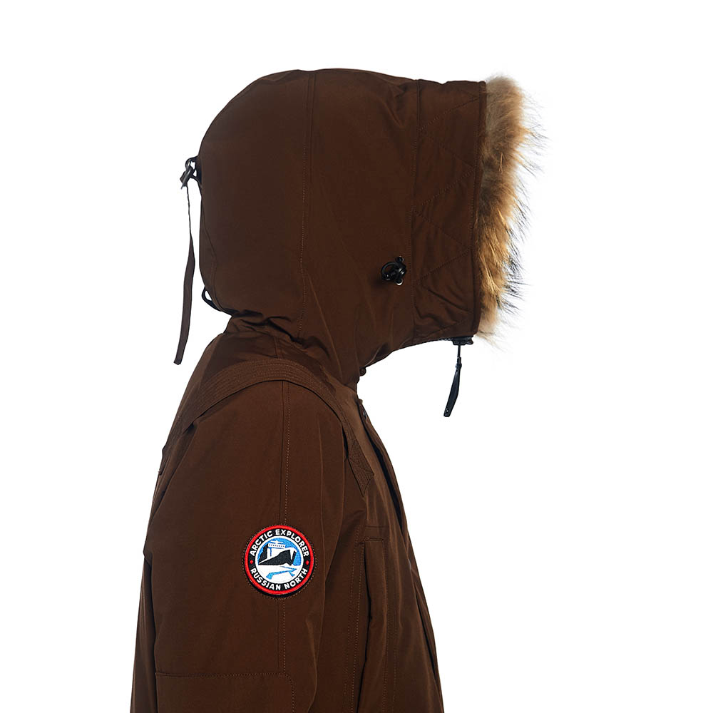 CHILL сохранила все отличительные особенности изделий бренда: съемный шеврон Arctic Explorer на рукаве и нашивку Russian North на хлястике капюшона, внутренние теплые манжеты; капюшон-труба с опушкой из натурального меха (отстегивается); утяжки на капюшоне и талии; погон на одном плече – реплика на полярные погоны. А также: