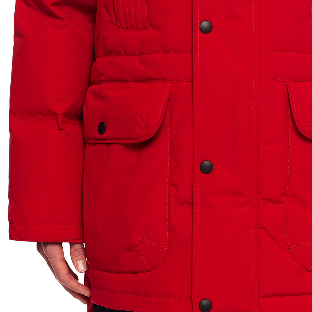 Модель застегивается на двухзамковую молнию и имеет ветрозащитные планки над/под молнией; 4 внешних кармана и 1 внутренний карман; утеплитель из гусиного пуха. А также: