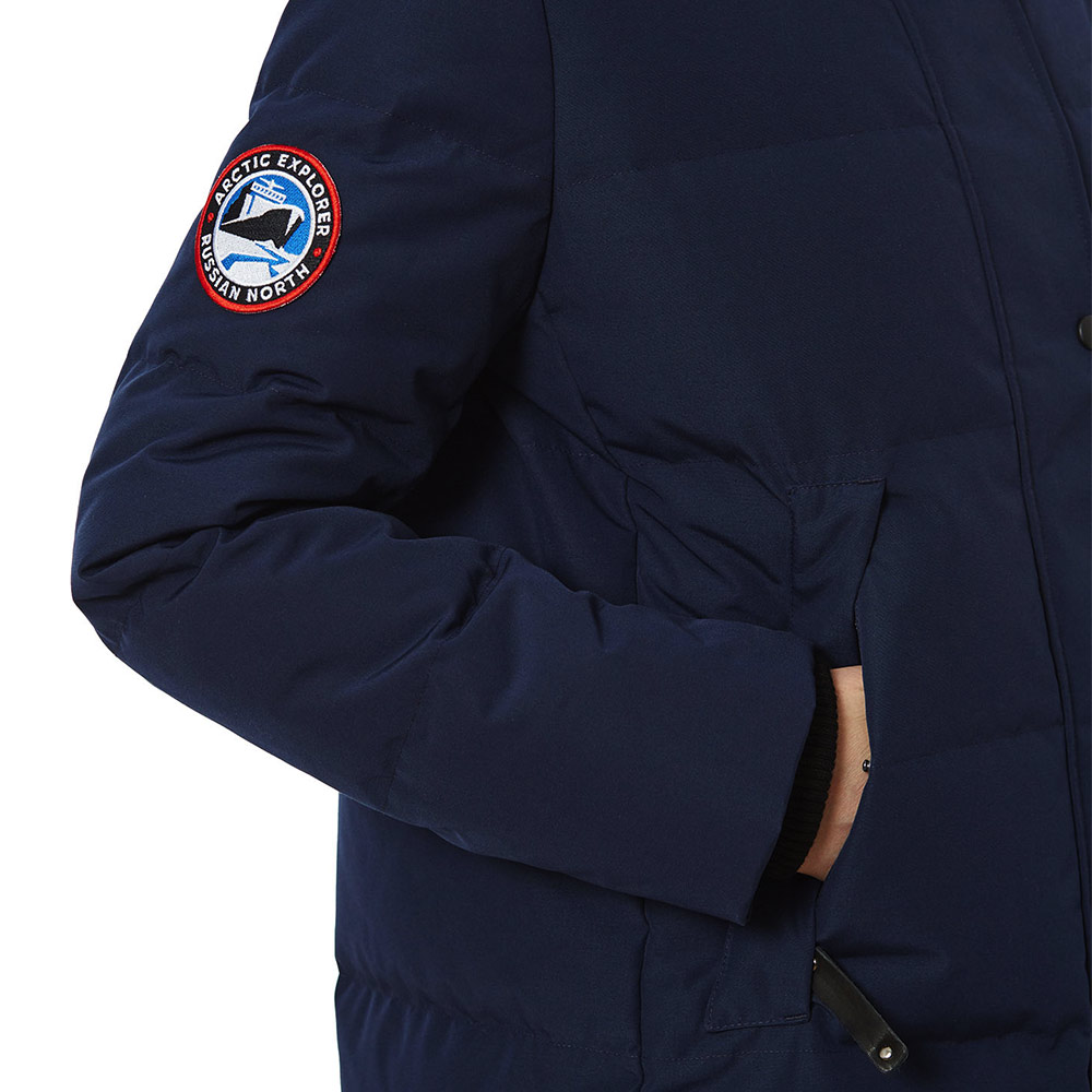 - Шеврон Arctic Explorer, нашивка Russian North на хлястике капюшона;