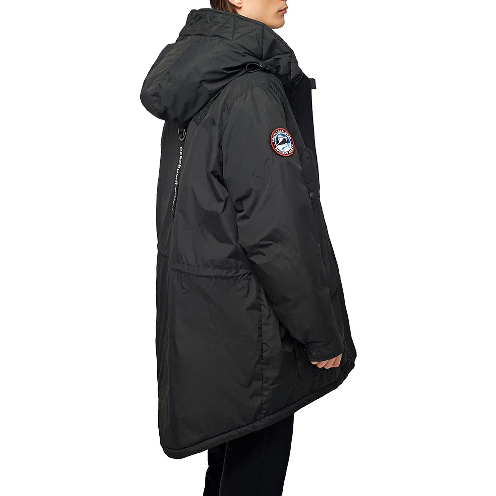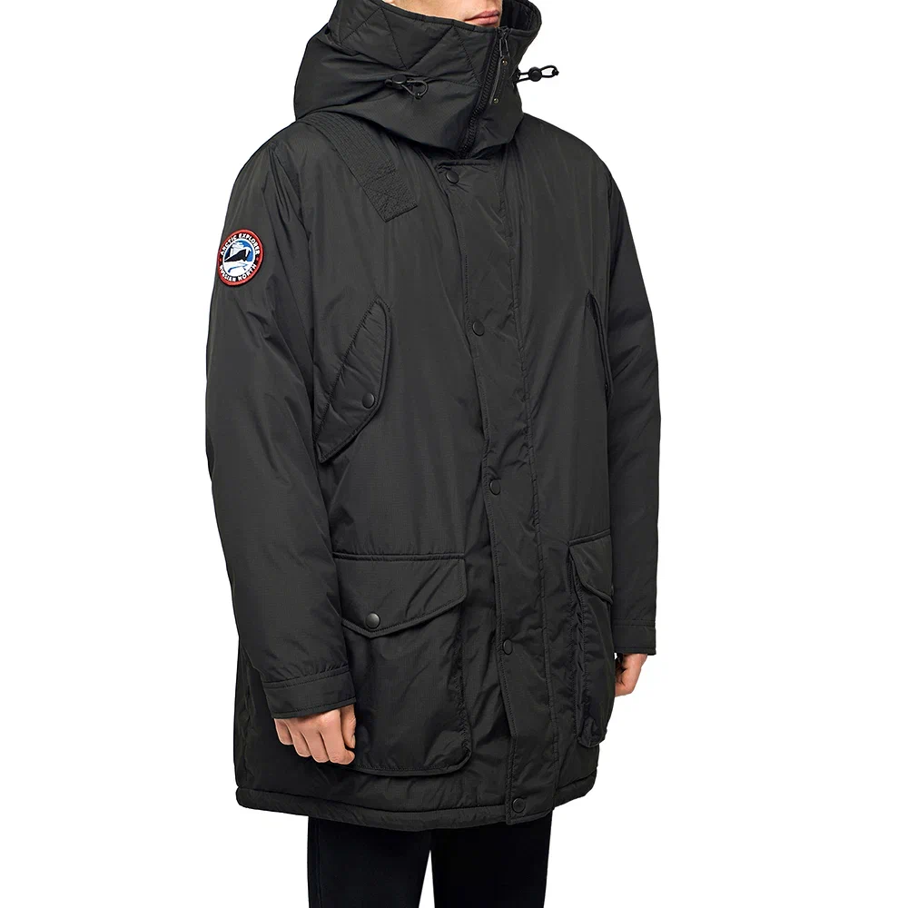 - Фирменный декор: съемный шеврон «Аrctic Explorer» на рукаве, погон на одном плече, повторяющий настоящие полярные погоны, нашивка «Северный полюс» на хлястике капюшона.