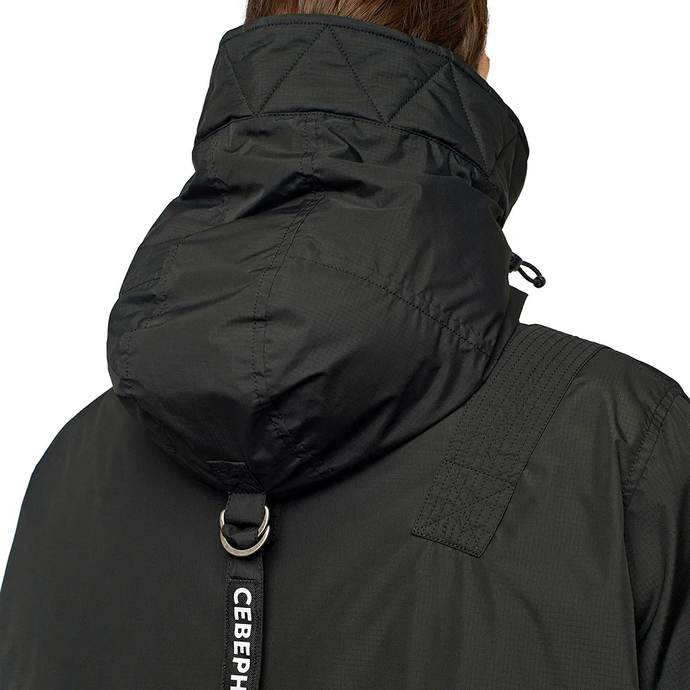 - Удобный капюшон формы «труба», оснащенный утяжкой для самостоятельной регулировки посадки.